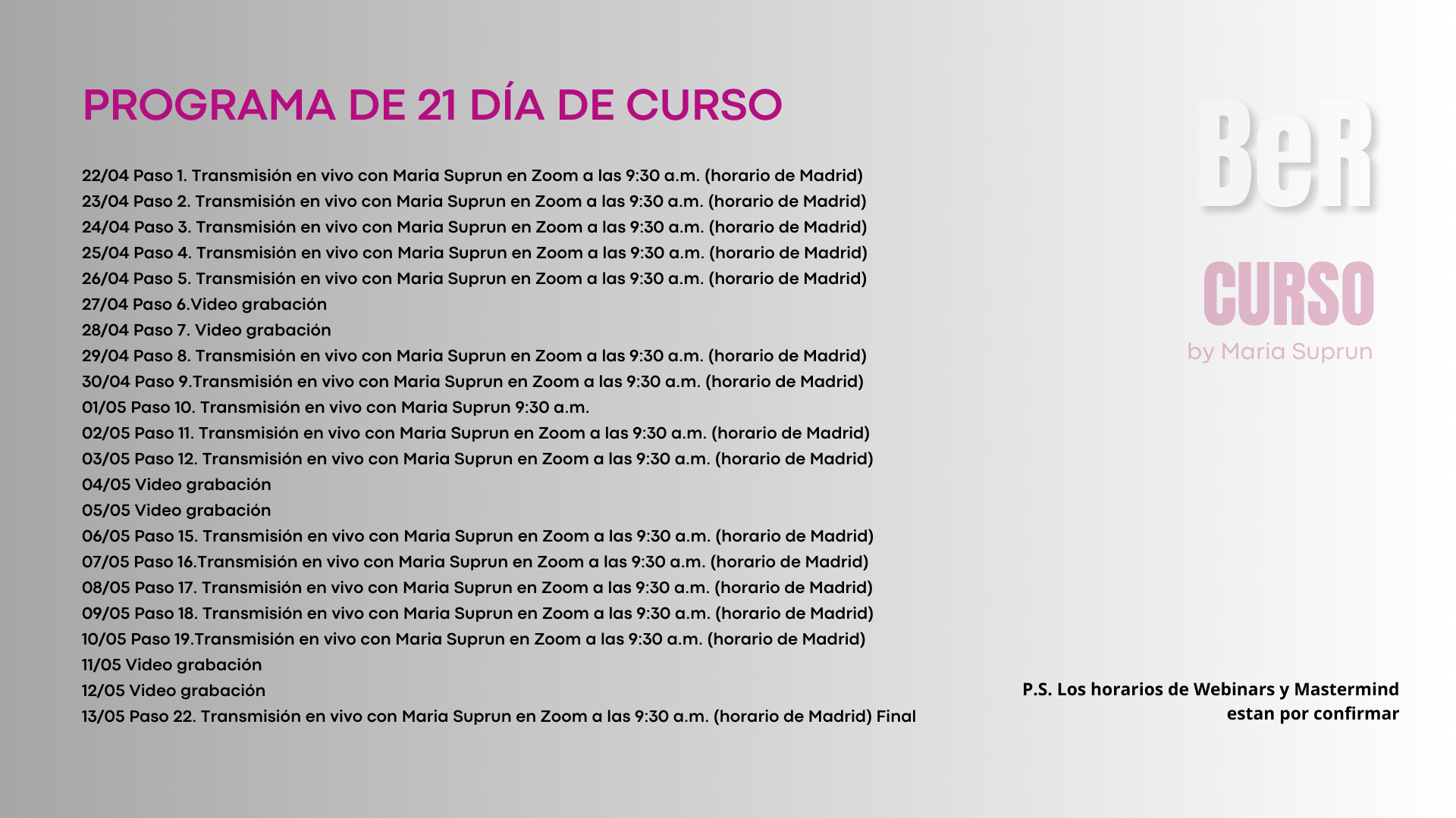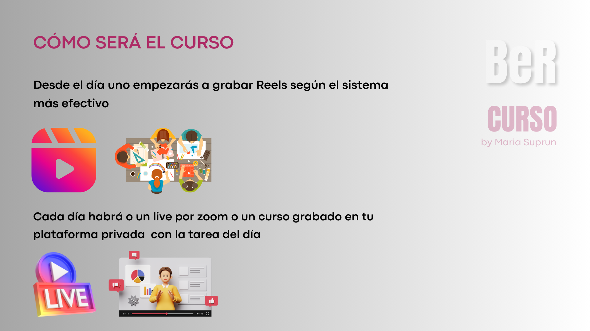 Cada día habrá o un live por zoom o un curso grabado en tu plataforma privada con la tarea del día