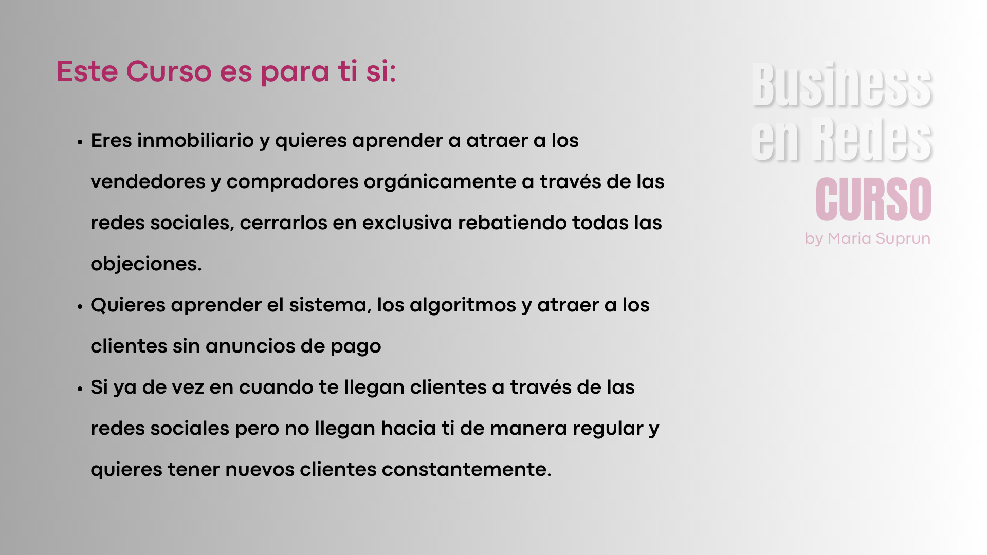 - Eres inmobiliario y quieres aprender a atraer a los vendedores y compradores orgánicamente a través de las redes sociales, cerrarlos en exclusiva rebatiendo todas las objeciones.